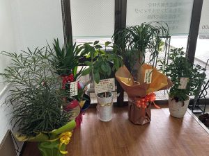 お祝いでいただいたお花や観葉植物に囲まれ、